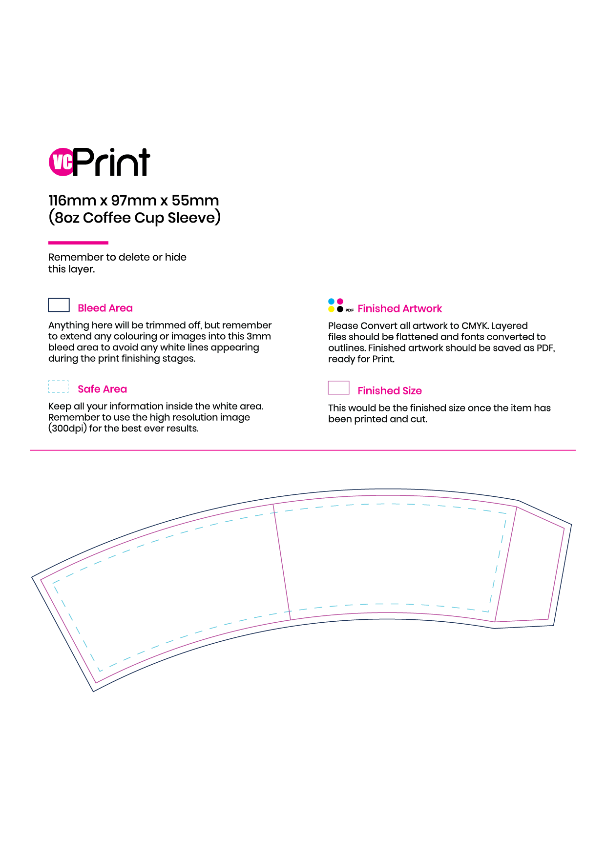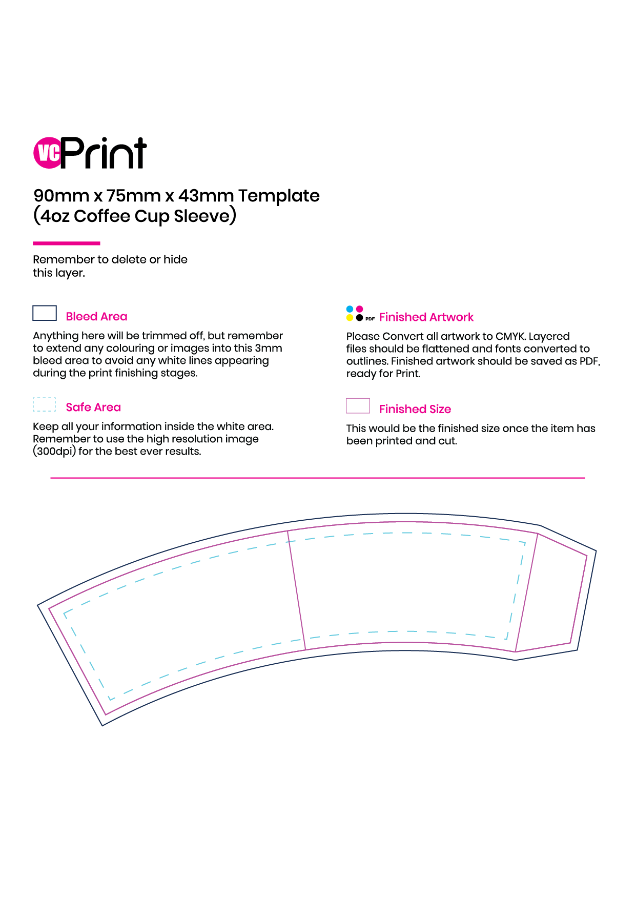 You can order printed coffee sleeves from us in three standard sizes – 8oz (112mm x 53mm), 12oz (122mm x 60mm) and 16oz (126mm x 60mm). However, bespoke sizes are also available as optional extras.