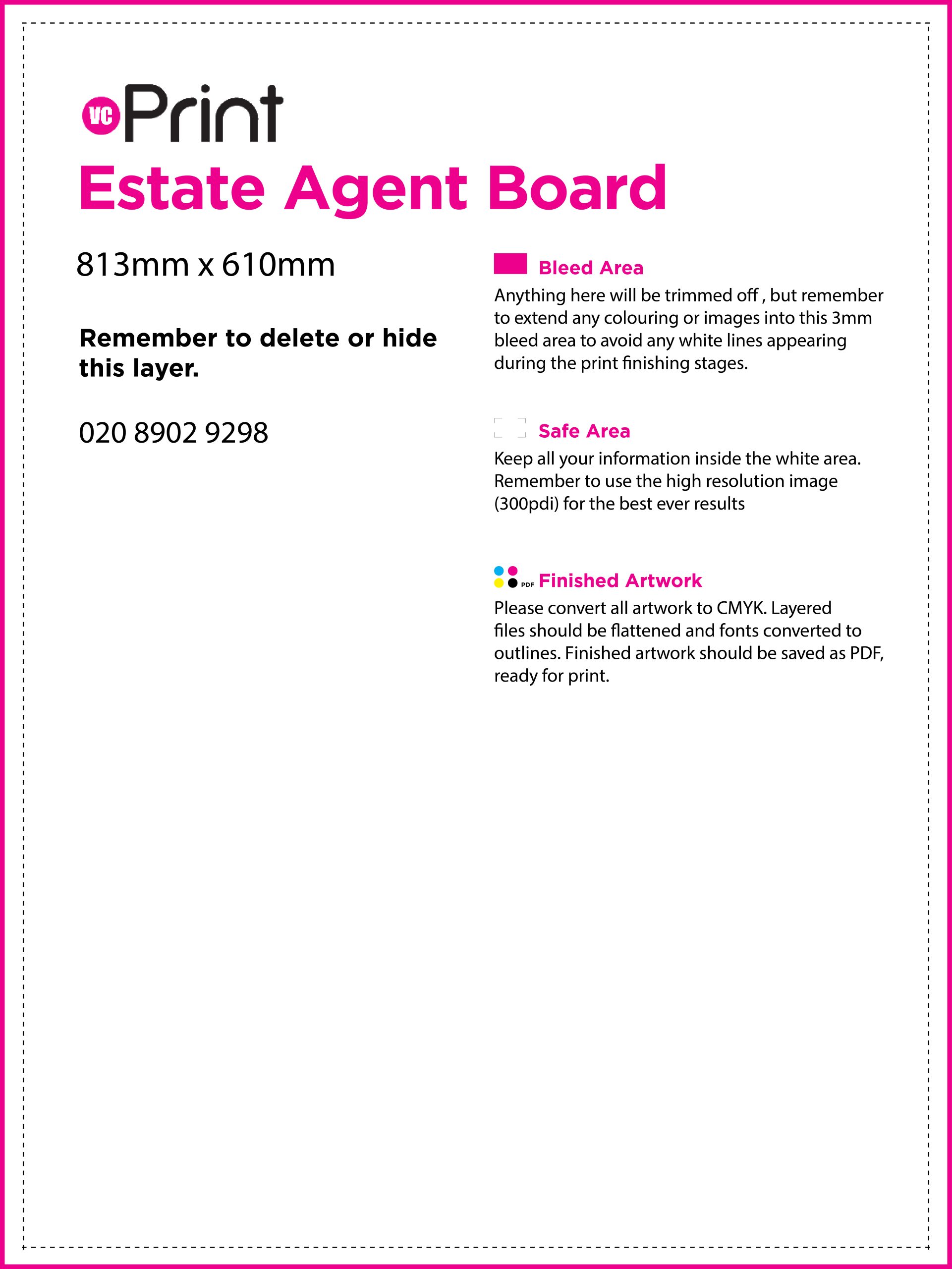 We print estate agent for sale boards as per the following specifications: