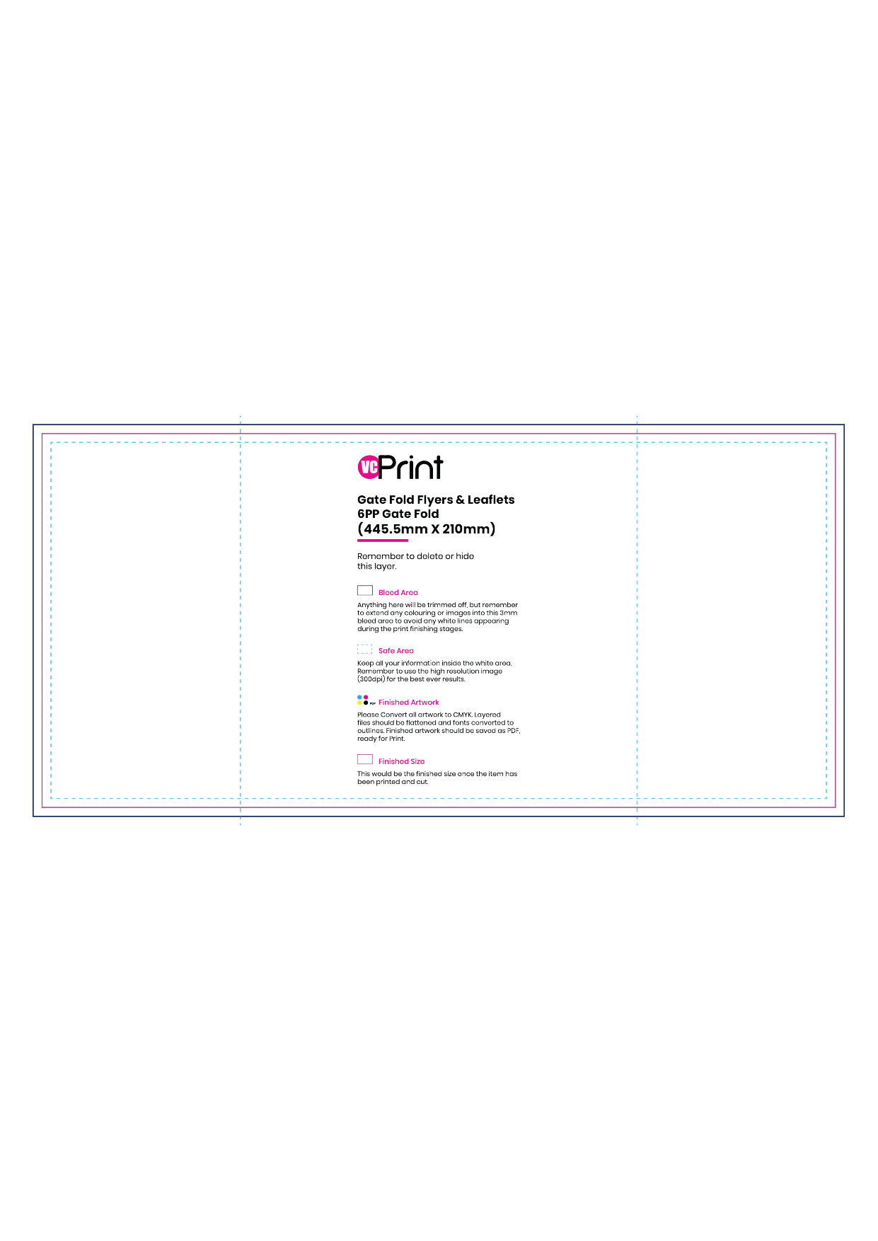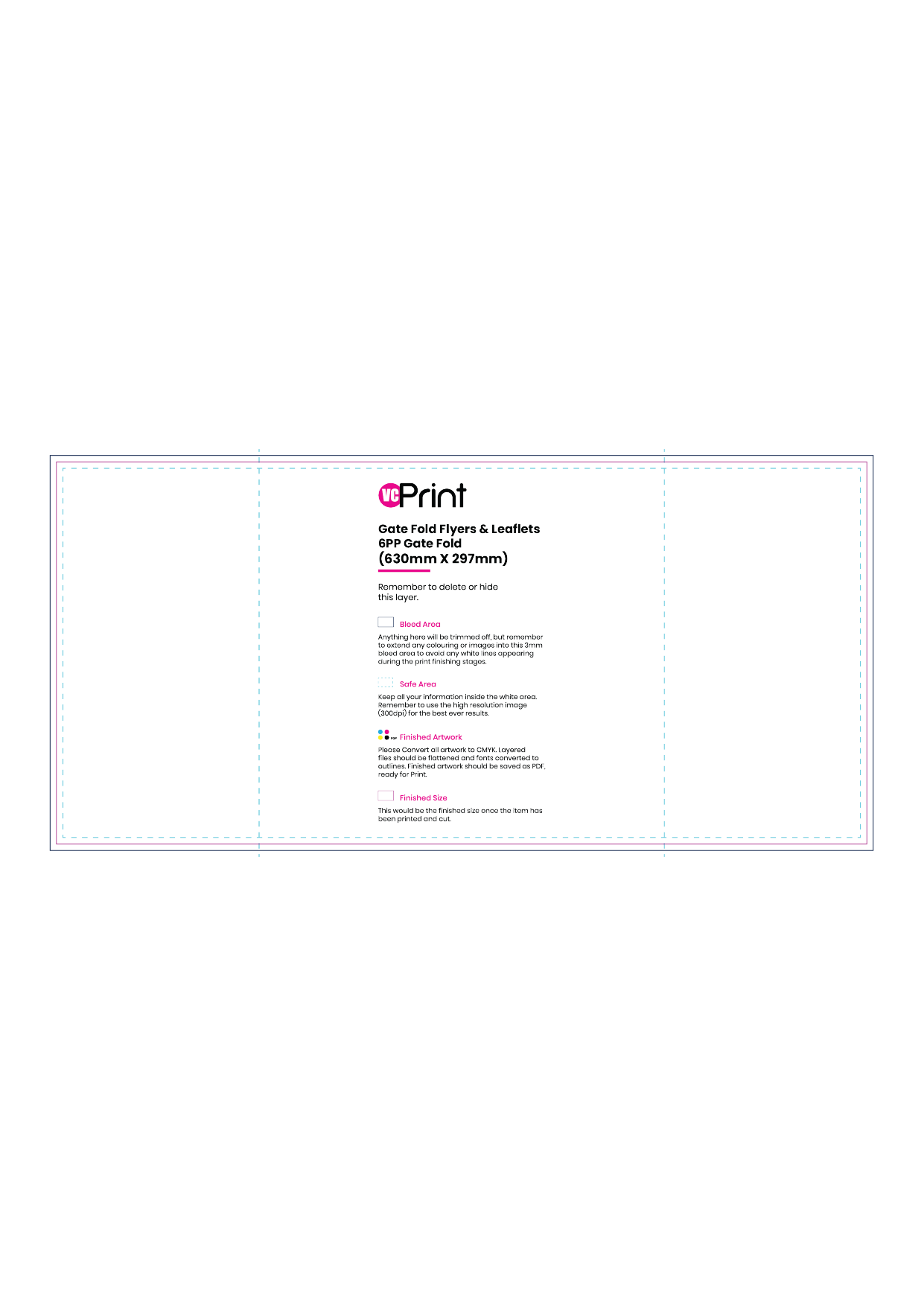 A gate fold leaflet is produced from a single sheet, where both sides fold towards the middle without overlapping. When closed, the outer panels conceal the inner content, building anticipation before revealing the core message.